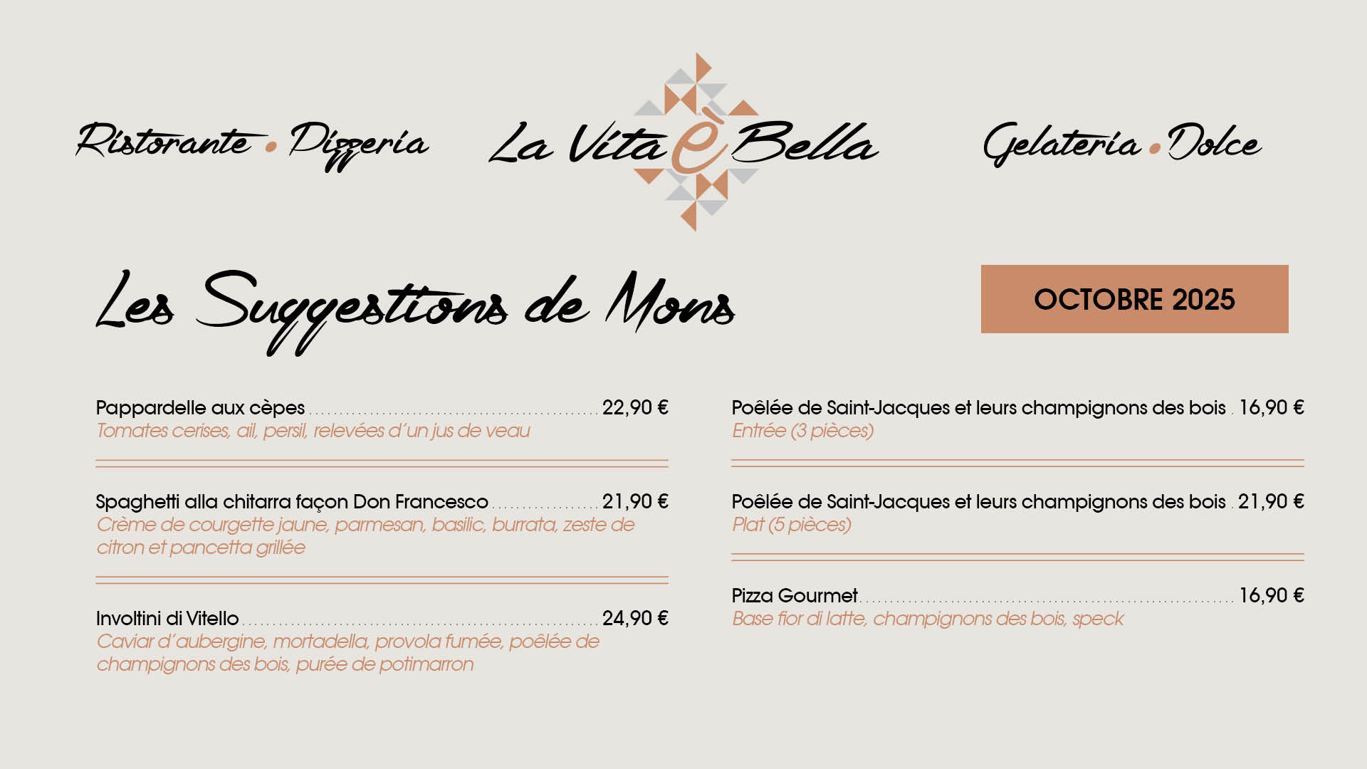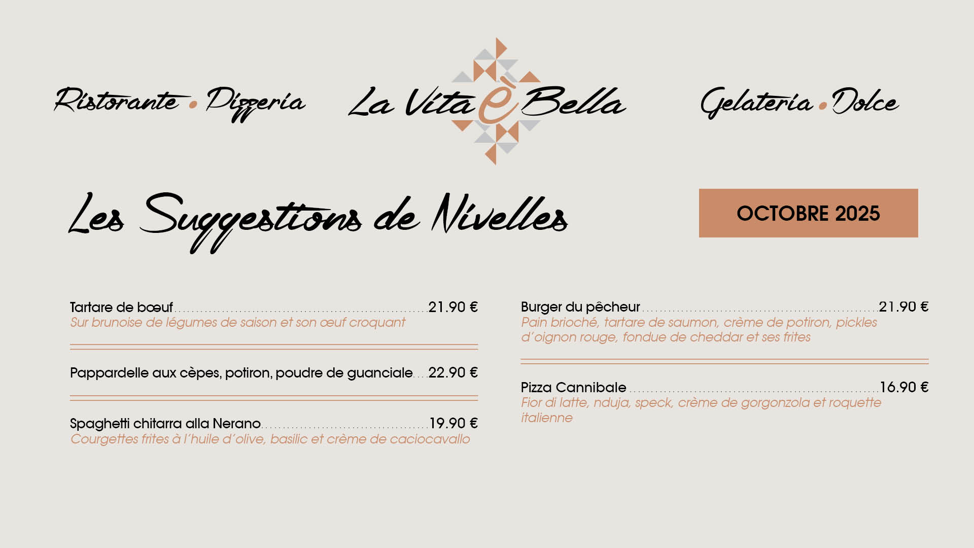 La vita é bella est un restaurant, mais également une brasserie, pizzeria et gelateria. Spécialité de pizzas au feu de bois et vaste choix de glaces italiennes.