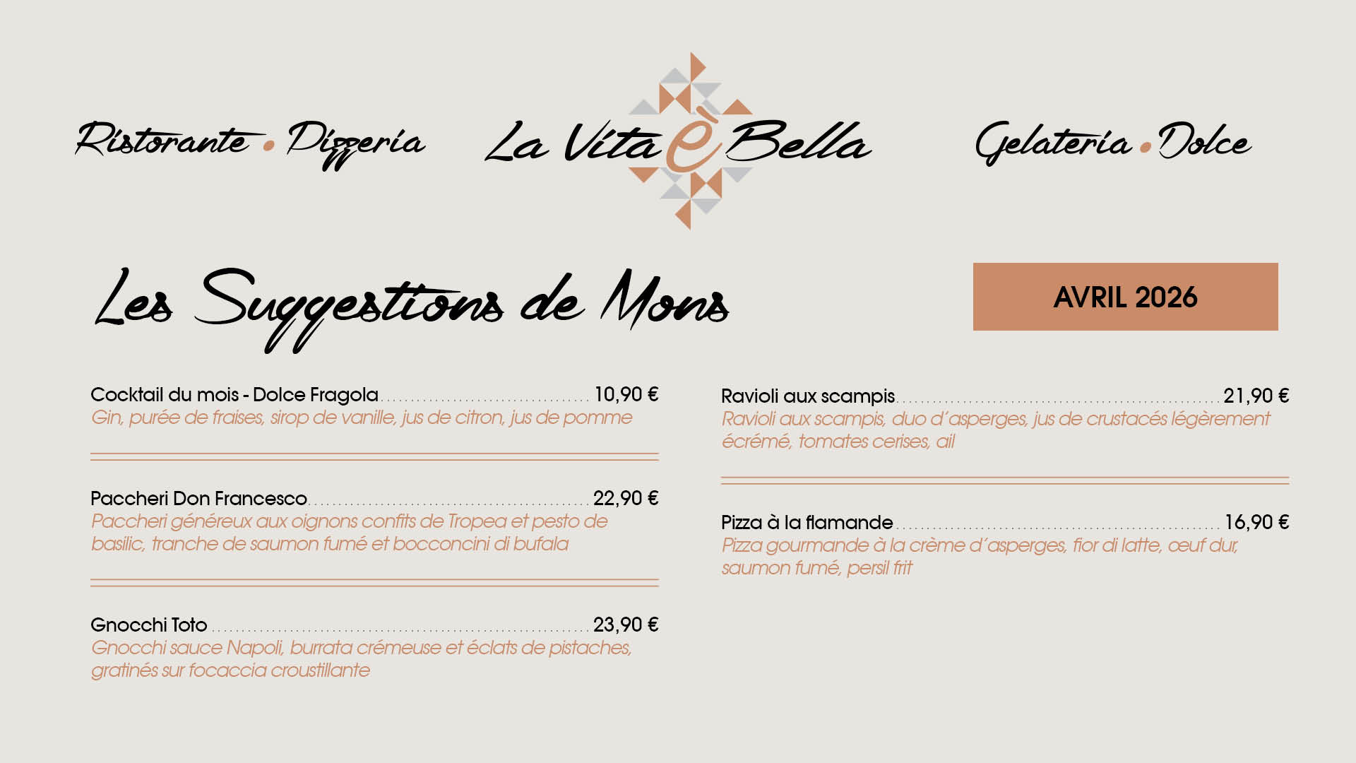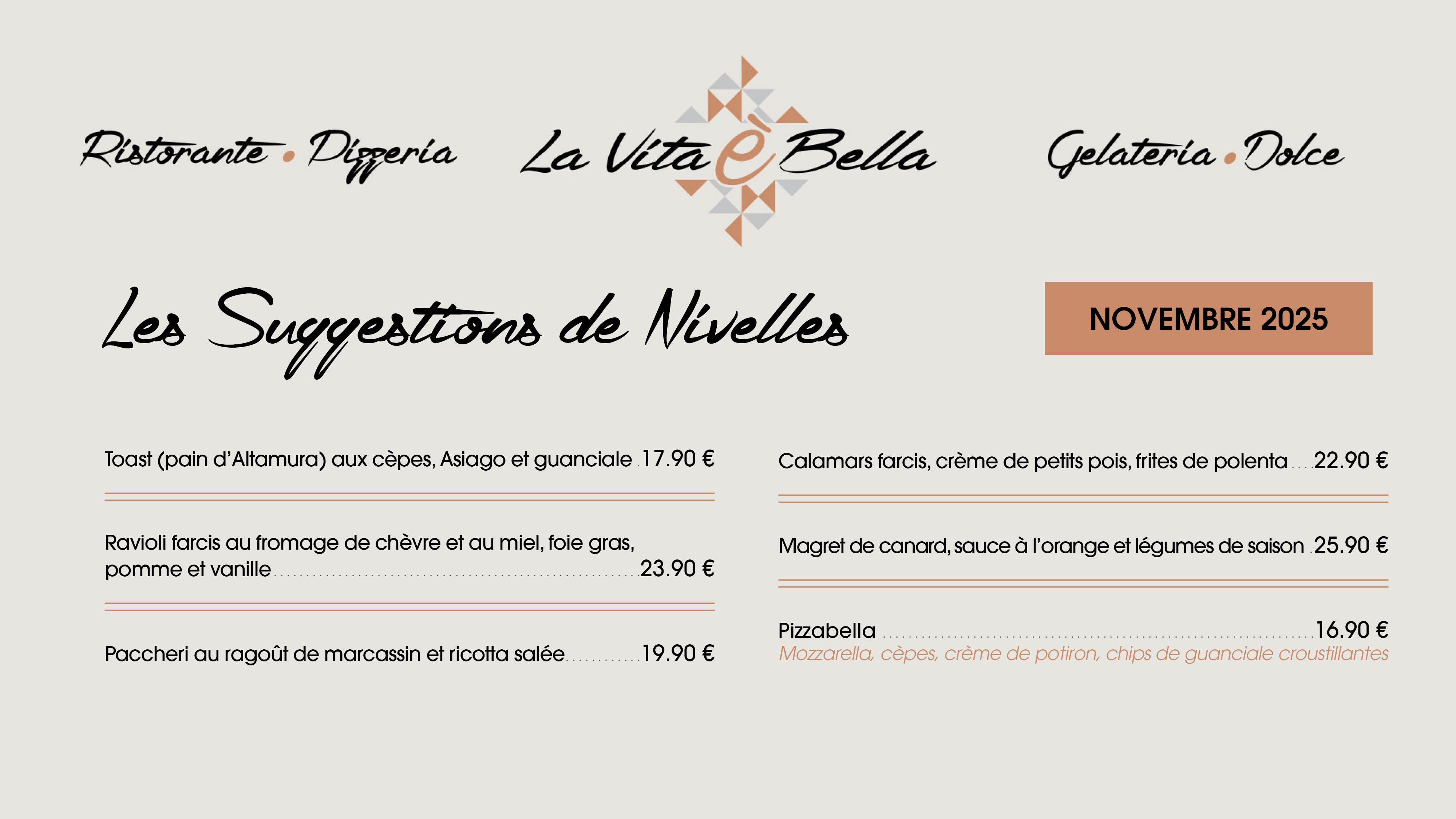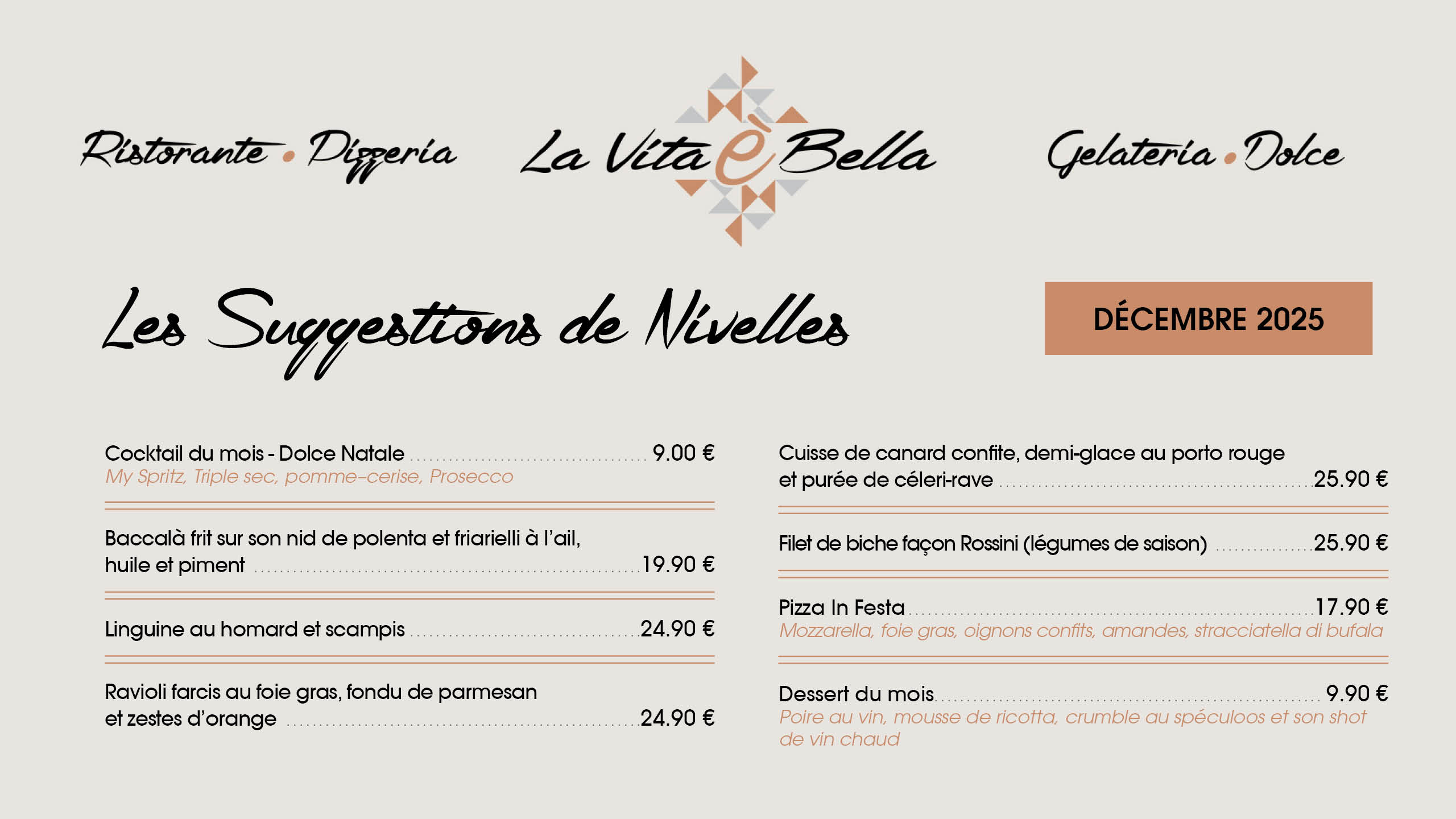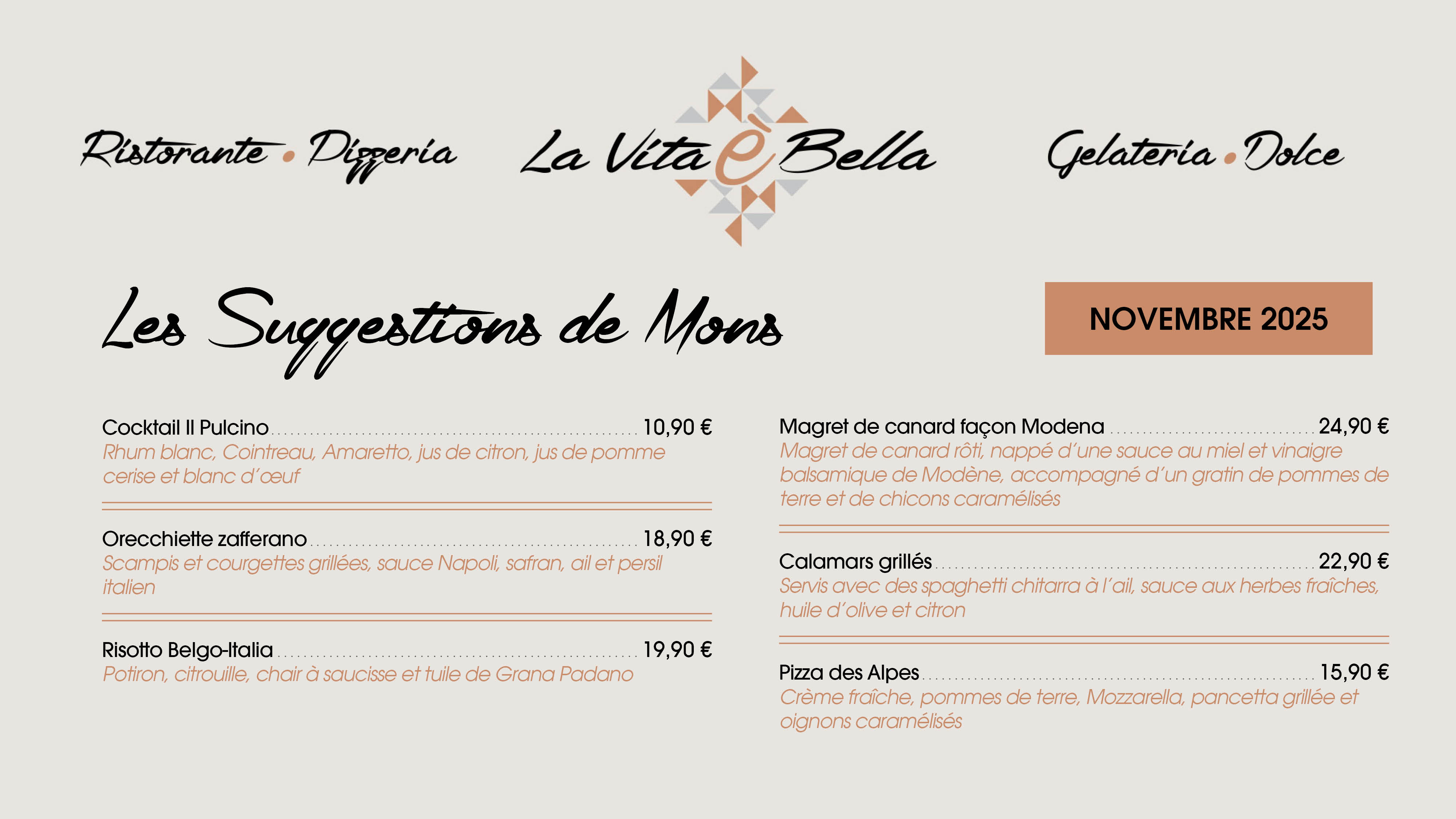 La vita é bella est un restaurant, mais également une brasserie, pizzeria et gelateria. Spécialité de pizzas au feu de bois et vaste choix de glaces italiennes.