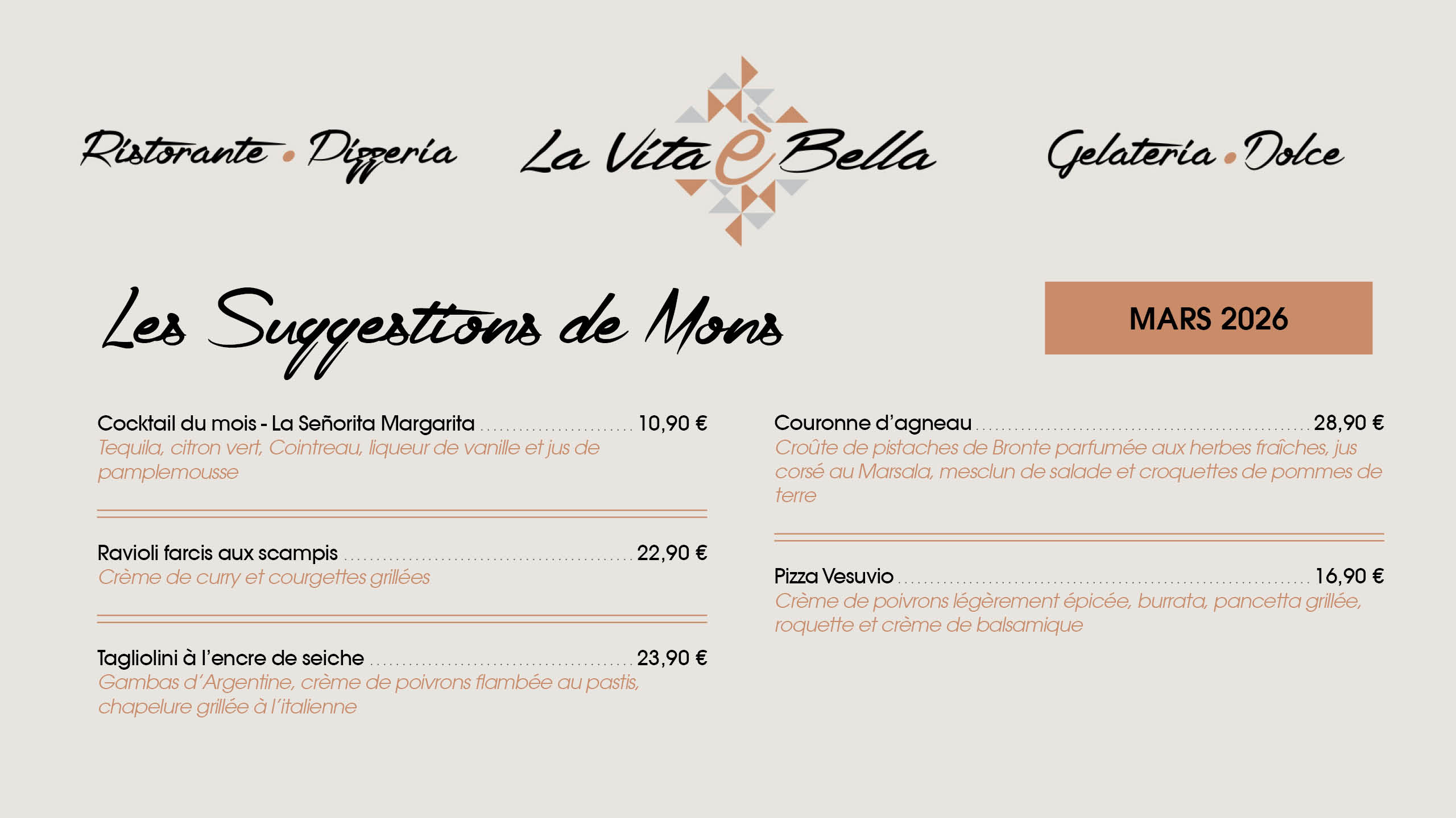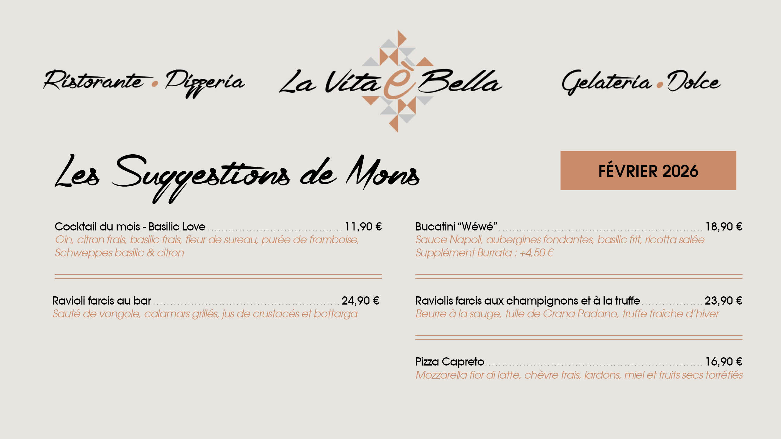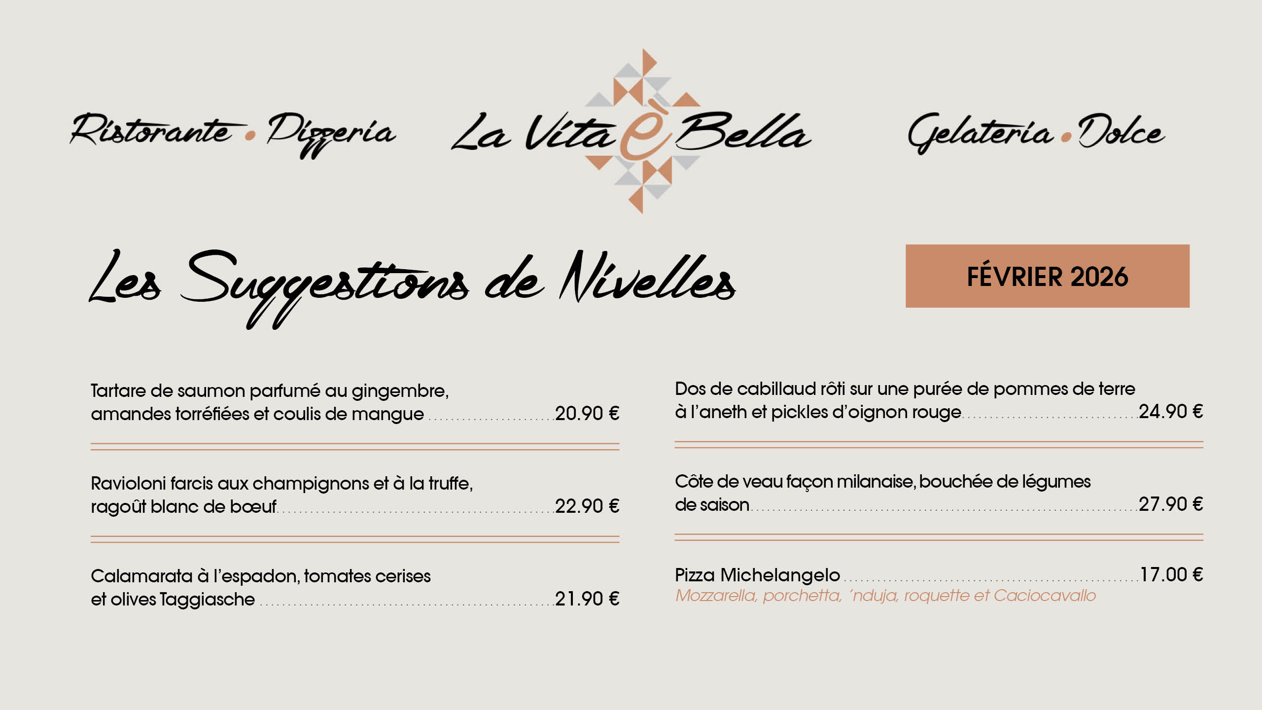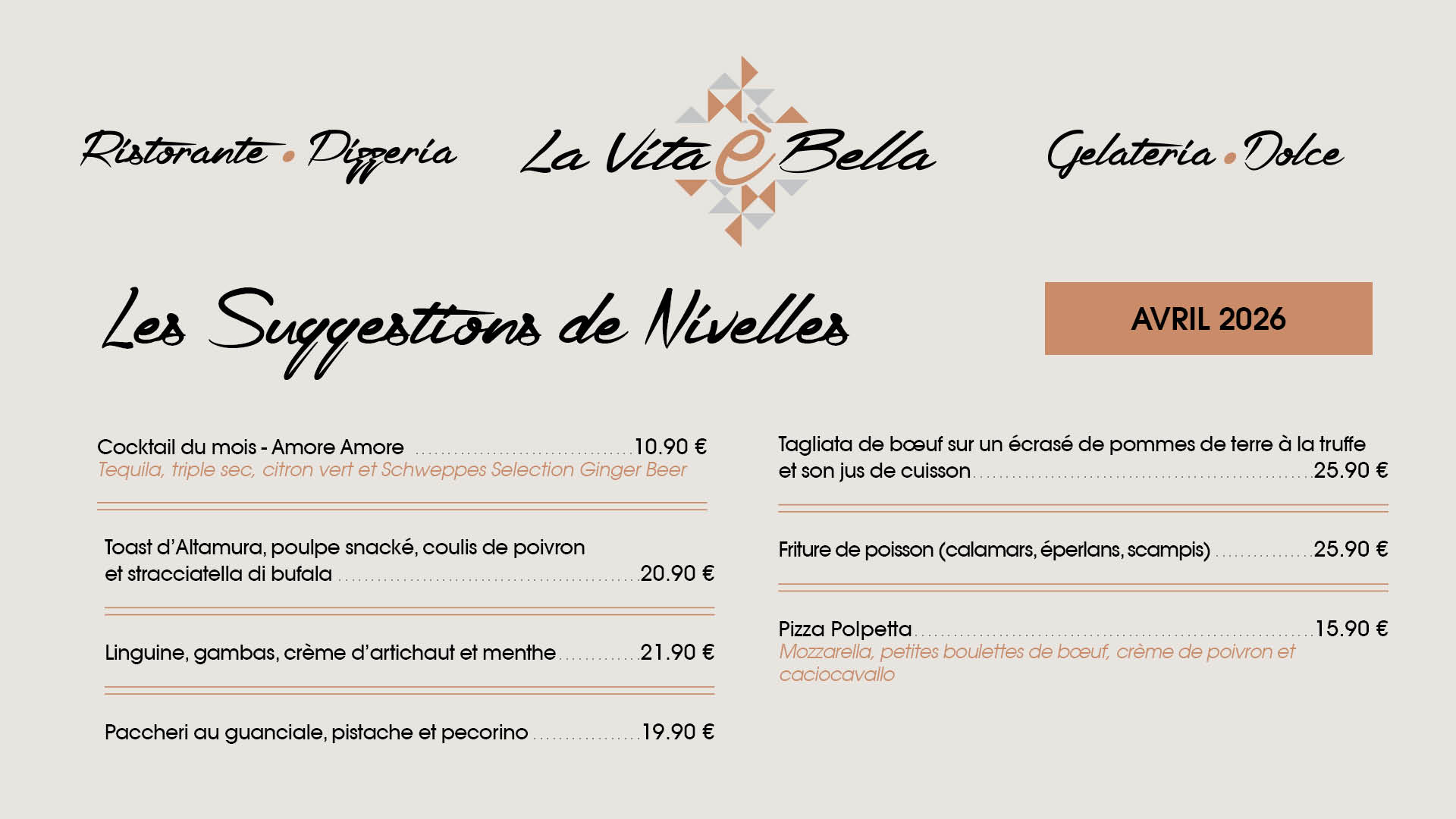 La vita é bella est un restaurant, mais également une brasserie, pizzeria et gelateria. Spécialité de pizzas au feu de bois et vaste choix de glaces italiennes.